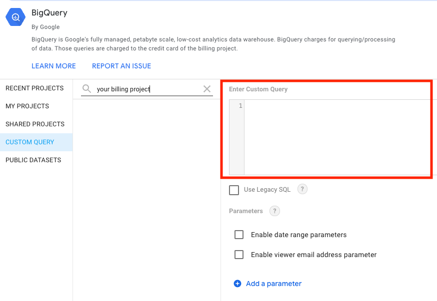 1. Select BigQuery and choose CUSTOM QUERY and select your desired Billing Project where the query will be charged