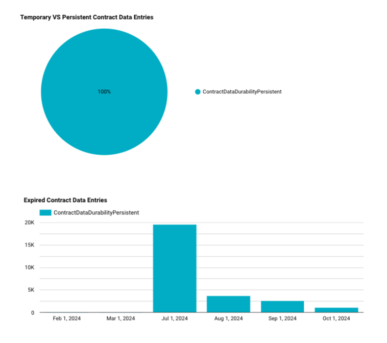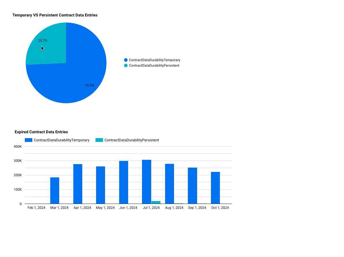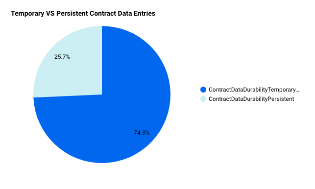 As you can see, persistent contract data entries account for roughly 25% of all contract data entries with the rest being temporary. There are also a lot more expired temporary contract data entries. This is expected because temporay entries cannot be bumped whereas persistent entries can be bumped/restored. For more information, you can read about State Archival and the Contract Data Lifecycle.